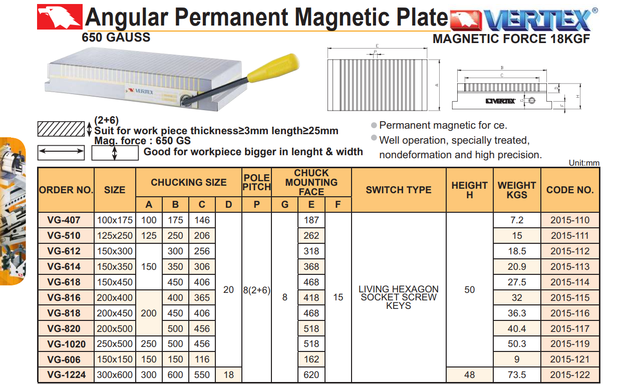 – Bàn từ máy mài VG của Vertex là bàn từ nam châm vĩnh cửu, lực hút của bàn từ đạt 18KGF (650 Gauss).