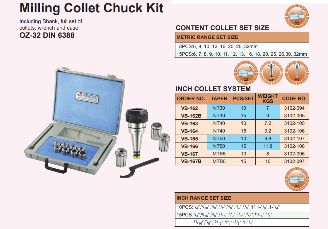 – 1 bộ bầu kẹp collet OZ32 bao gồm: 1 bầu kẹp, 1 chìa vặn, 1 hộp đựng và 8 hoặc 15 collet.
