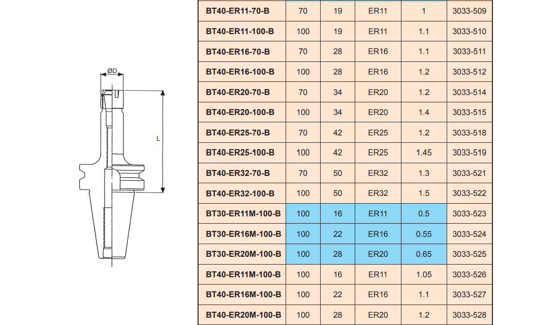 Bầu kẹp dao phay chính xác kiểu BT mã gồm BT-30-ER11-60-B, BT30-ER11-100-B, BT30-ER16-60-B, BT30-ER16-100-B, BT30-ER20-60-B, BT30-ER20-100-B, BT30-ER25-60-B, BT30-ER32-60-B, BT40-ER11-70-B, BT40-ER11-100-B, BT40-ER16-70-B, BT40-ER16-100-B, BT40-ER20-70-B, BT40-ER20-100-B, BT40-ER25-70-B, BT40-ER25-100-B, BT40-ER32-70-B, BT40-ER32-100-B, BT30-ER11M-100-B, BT30-ER16M-100-B, BT30-ER20M-100-B, BT40-ER11M-100-B, BT40-ER16M-100-B, BT40-ER20M-100-B
