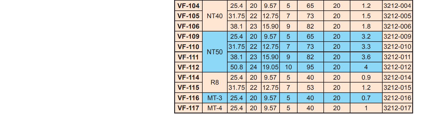 Bầu kẹp dao phay khỏa mặt NT30, NT40, NT50, R8, MT3, MT4 hệ Inch: , VF-109, VF-110, VF-111, VF-112, VF-114, VF-115, VF-116, VF-117