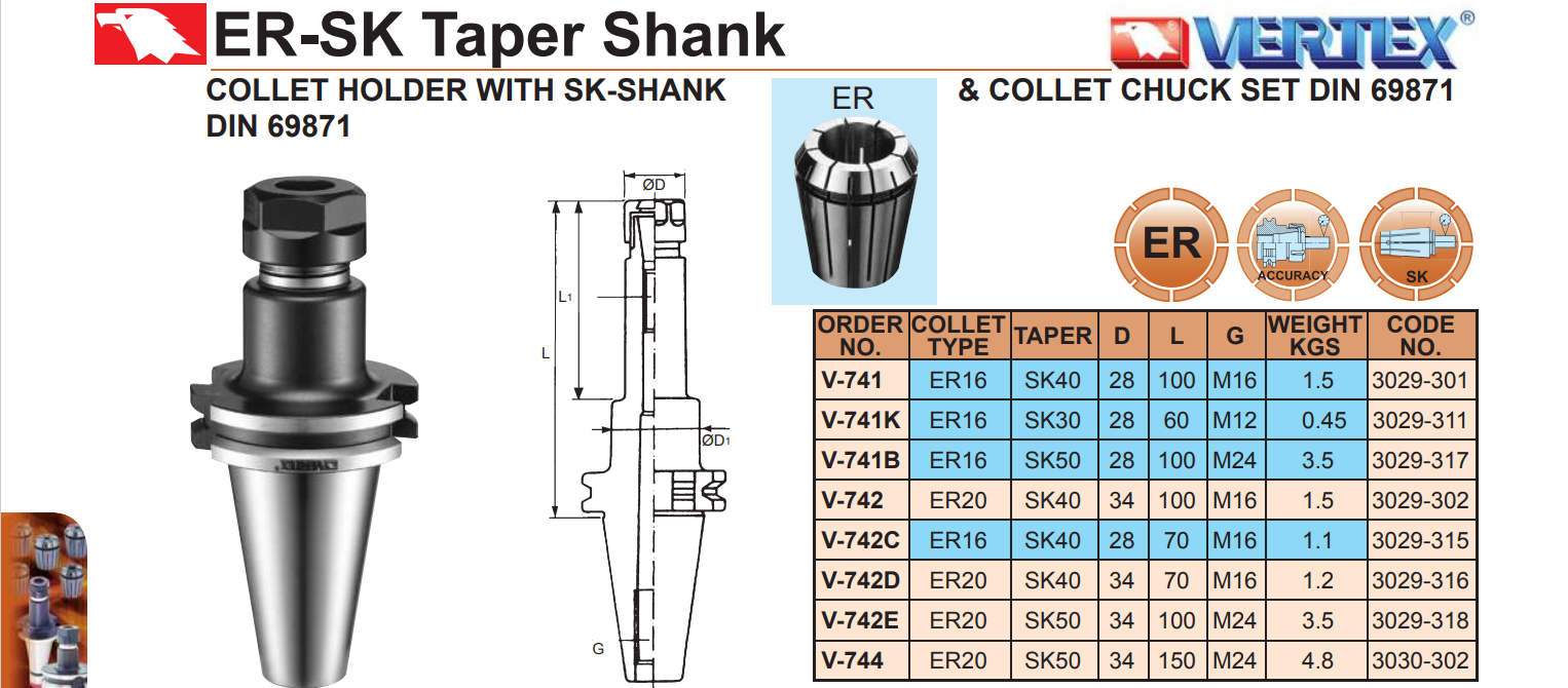 – Collet ER16, ER20, ER25, ER32, ER40 theo tiêu chuẩn DIN 6499 (xem sản phẩm Collet ER).