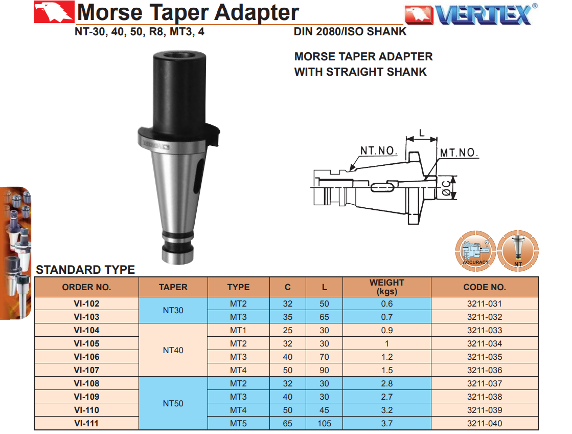 Bầu kẹp nối chuyển từ NT30, NT40, NT50 sang MT1, MT2, MT3, MT4, MT5: VI-102, VI-103, VI-104, VI-105, VI-106, VI-107, VI-108, VI-109, VI-110, VI-111 của VERTEX sử dụng kẹp các bầu kẹp chuôi côn MT, mũi khoan chuôi côn, trên máy phay thường có kiểu côn trục chính là NT30, NT40, NT50.