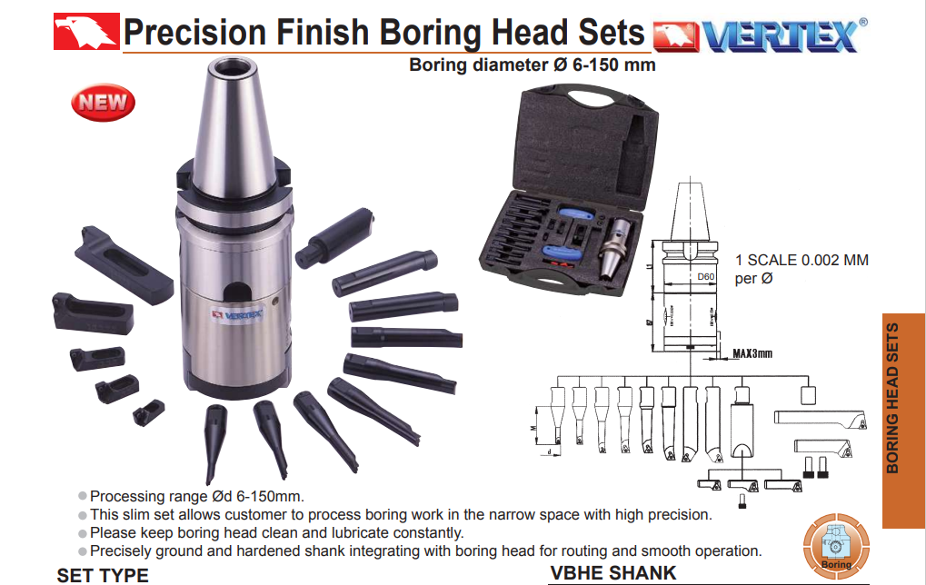 – Bộ đầu doa tinh VBHE của VERTEX được sử dụng thích hợp doa chính xác các lỗ có đường kính từ 6-150mm.