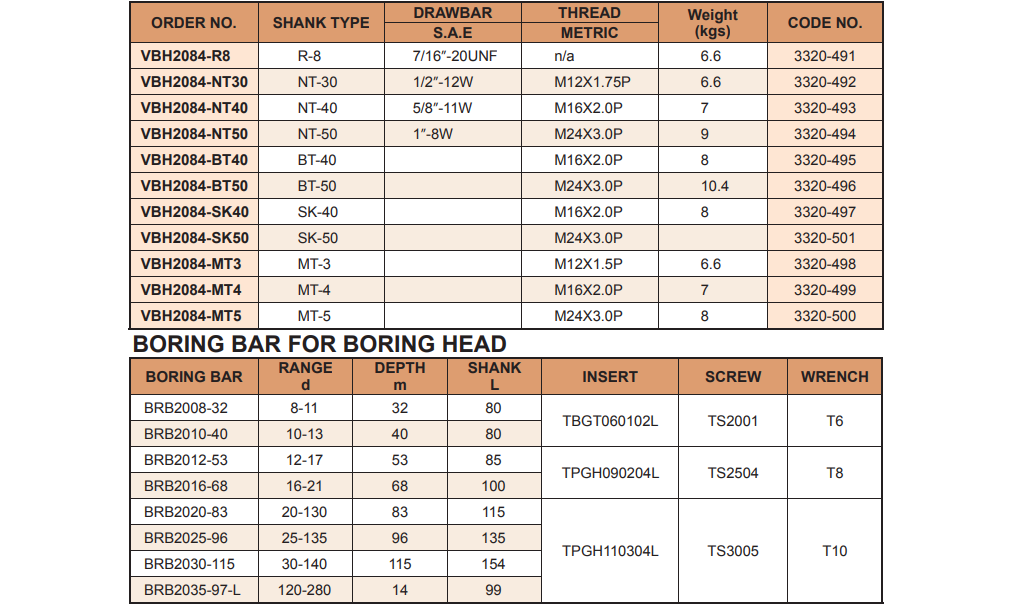 – Bộ đầu doa VBH2084 của VERTEX: VBH2084-R8, VBH2084-NT30, VBH2084-NT40, VBH2084-NT50, VBH2084-BT40, VBH2084-BT50, VBH2084-SK40, VBH2084-SK50, VBH2084-MT3, VBH2084-MT4, VBH2084-MT5 sử dụng thích hợp doa chính xác các lỗ có đường kính từ 8 – 280mm.