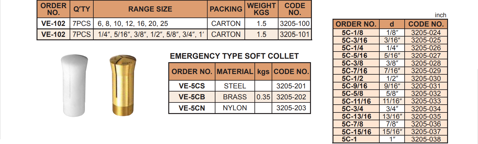 Mã sản phẩm: 5C-25, 5C-1/8, 5C-3/16, 5C-1/4, 5C-5/16, 5C-3/8