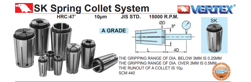 – Các collet SK của VERTEX được làm bằng vật liệu SCM 440.