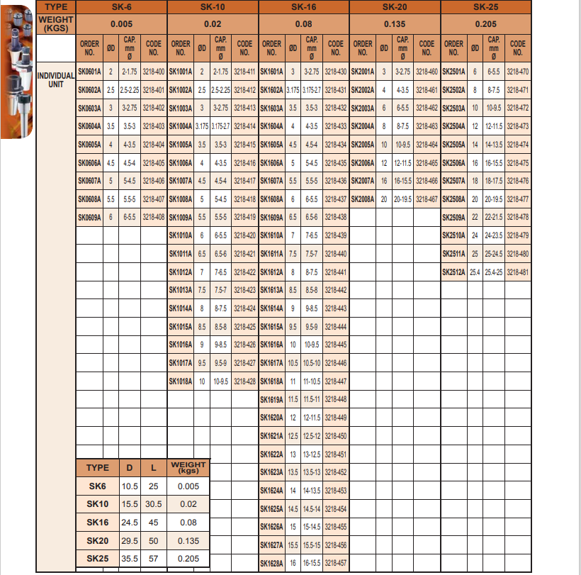– Thông số kích thước từng collet SK, quý khách tham khảo theo hình catalogue phía duới