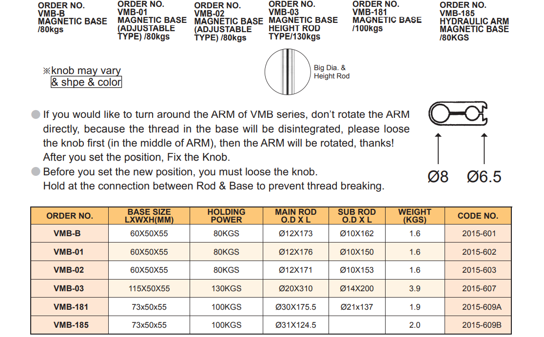– Đế từ gá đồng hồ so VMB của VERTEX có 2 lỗ F8 và F6.5 để gá kẹp đồng hồ so.