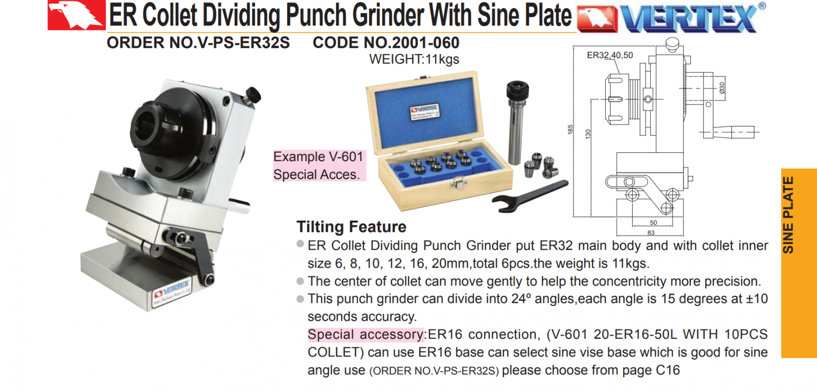 Dụng cụ sửa đá collet bàn nghiêng Vertex V-PS-ER32S được đặt trên bàn từ nghiêng và dùng collet để gá kẹp các mũi sửa đá và sửa đá mài theo các biên dạng khác nhau theo yêu cầu sử dụng