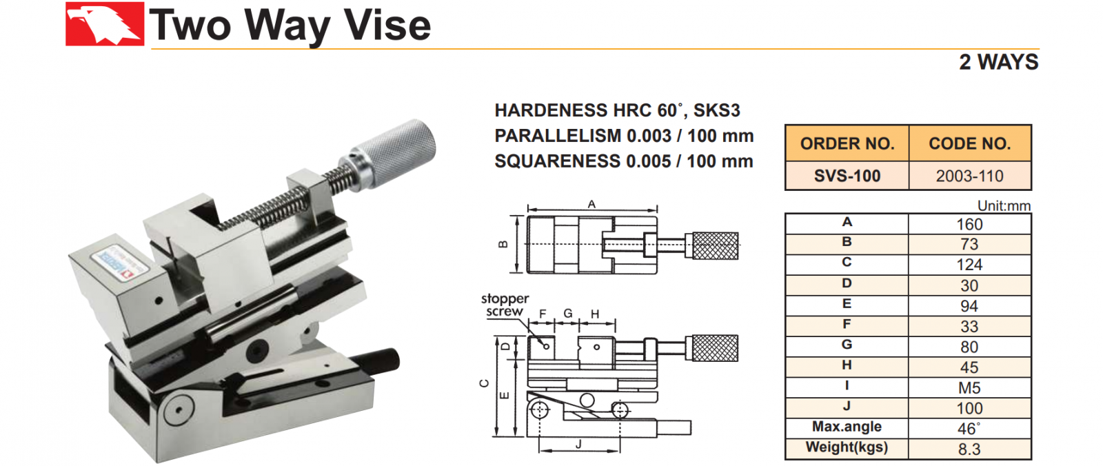 Ê tô nghiêng 2 chiều mã SVS-100 nhập khẩu từ Vertex, CO, CQ được cấp bởi phòng thương mại Đài Loan. Sản phẩm được phân phối, giao hàng tận nơi trên toàn quốc. Ê tô nghiêng xoay 2 chiều này được dùng chủ yếu trên máy mài, và một số máy gia công cơ khí khác.