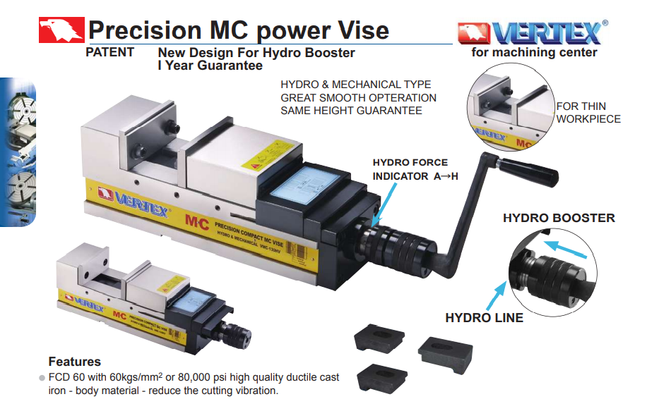 – Ê tô thủy lực MC của Vertex được thiết kế để kẹp chi tiết theo cả phương đứng và phương ngang khi gia công.