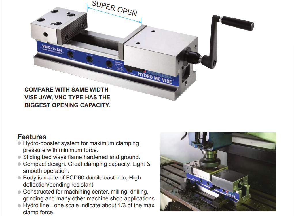 • Ê TÔ THỦY LỰC mã VNC-100H, VNC-125H, VNC-160H, VNC-160LH được hãng Vertex sản xuất với chất lượng cao, sản phẩm được sử dụng nhiều trên các loại máy phay CNC, NC, và một số loại máy phay vạn năng hay máy gia công cơ khí khác như máy mài, máy khoan, máy trung tâm gia công và ứng dụng cho nhiều máy khác...