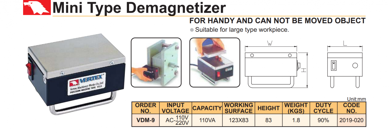 – Kích thước bề mặt khử từ của máy VDM-9 là: 123x83x83mm.