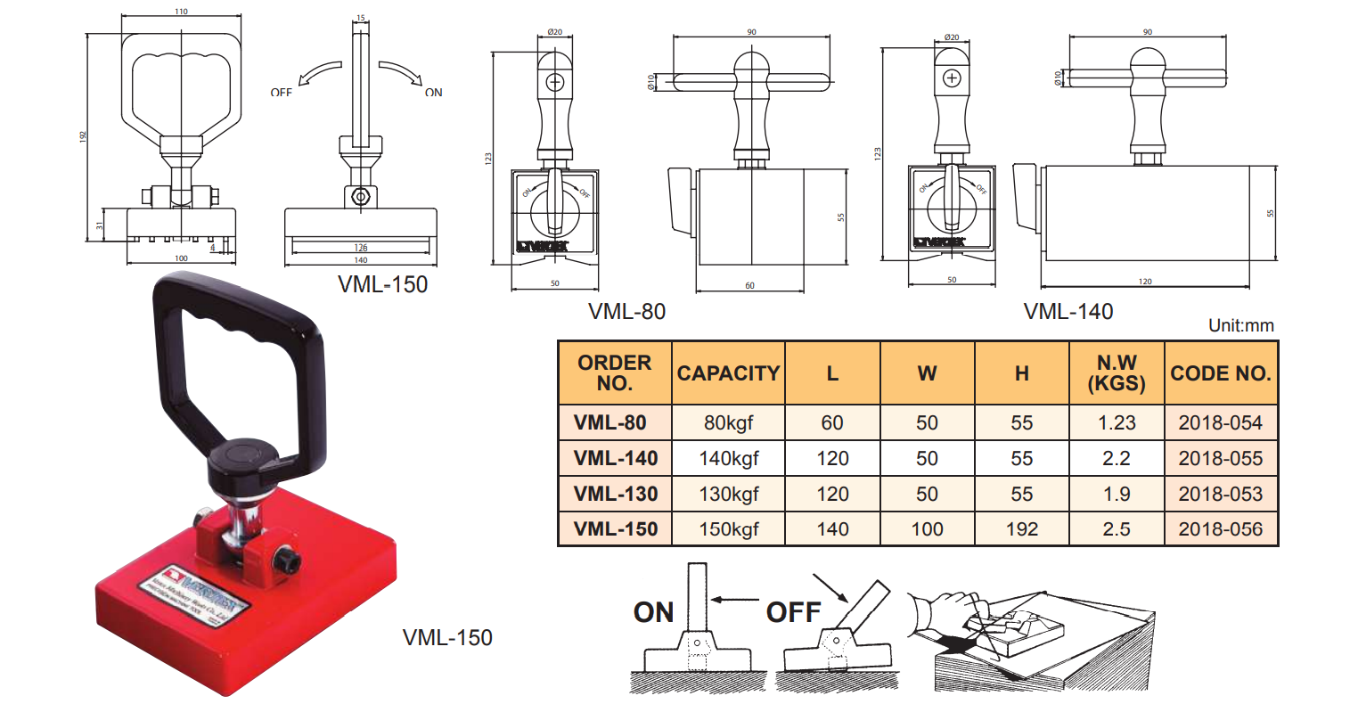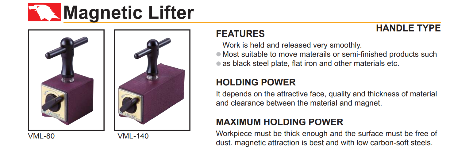 – Móc nâng hạ từ tính VML-80, VML-140, VML-130, VML-150 có kết cấu đơn giản. Hút và nhả lực hút từ rất nhẹ nhàng.