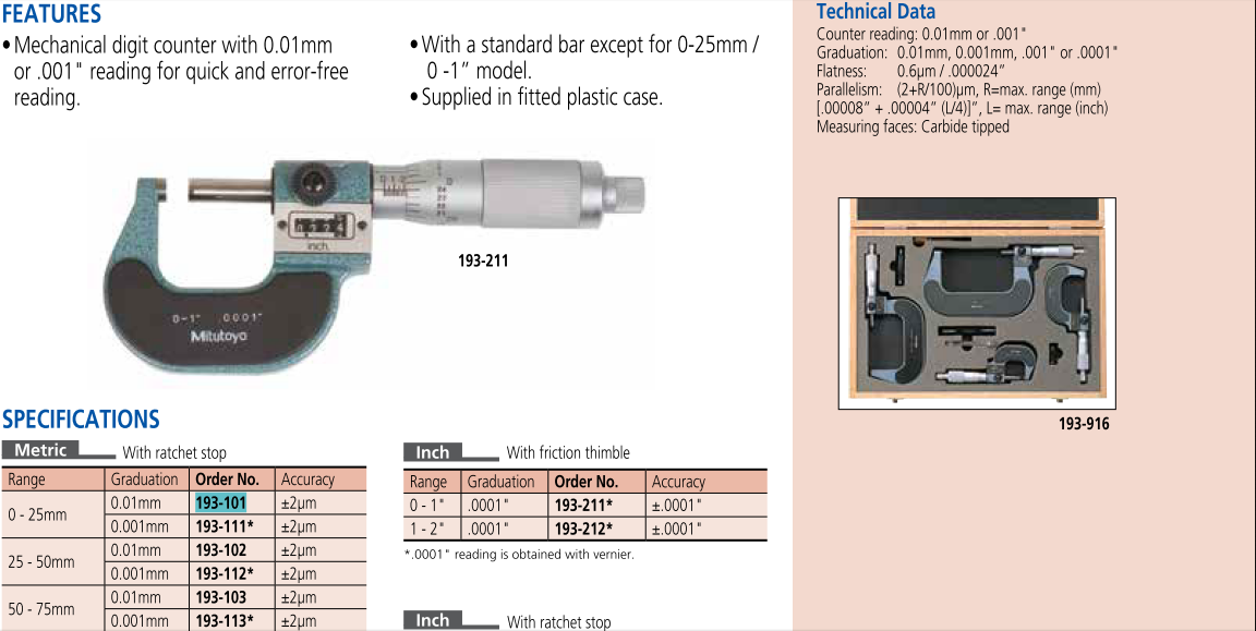 Mã hàng 193-112 là dụng cụ đo panme cơ khí đo ngoài khoảng đo từ 25-50mm/0.001mm