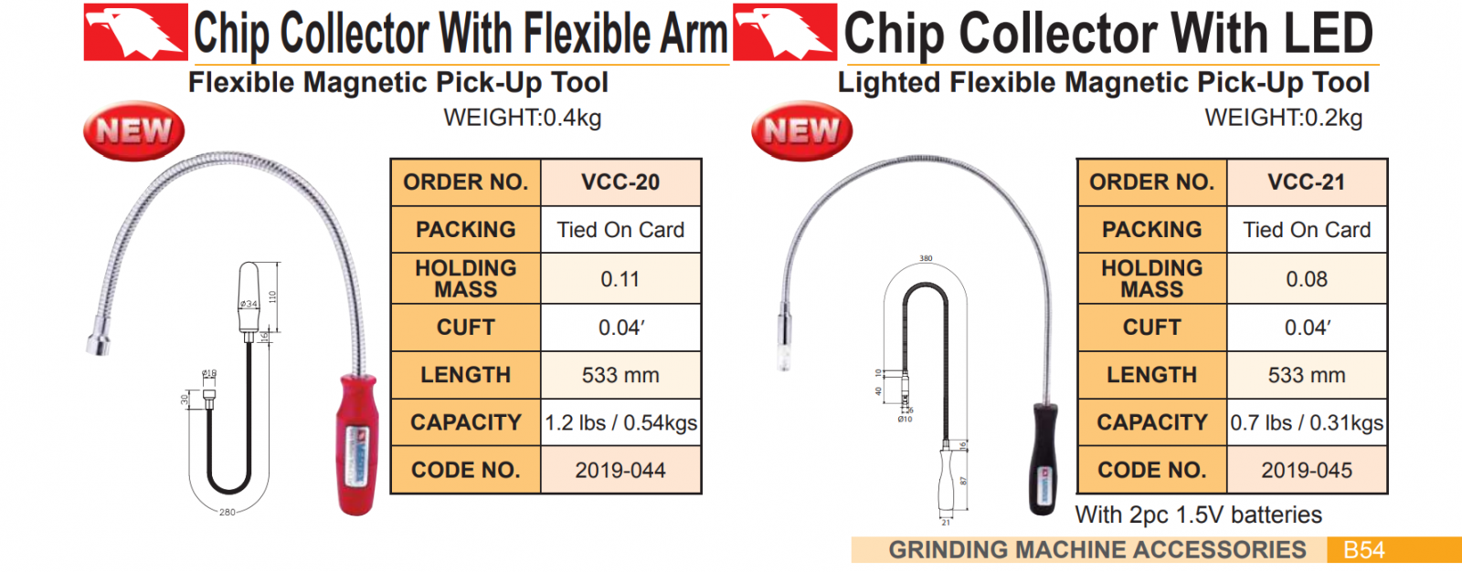 – Thiết bị thu phoi nam châm cán uốn cong VCC-21 có lắp đèn LED ở phần đầu hút, cho phép nhìn rõ phoi trong các khe thiếu ánh sáng. Thiết bị VCC-21 dùng 2 cục pin 1.5V.