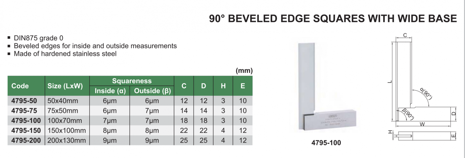 Thước đo góc INSIZE 4795-100 , 90 độ BEVELED EDGE SQUARES WITH WIDE BASE 4795-100