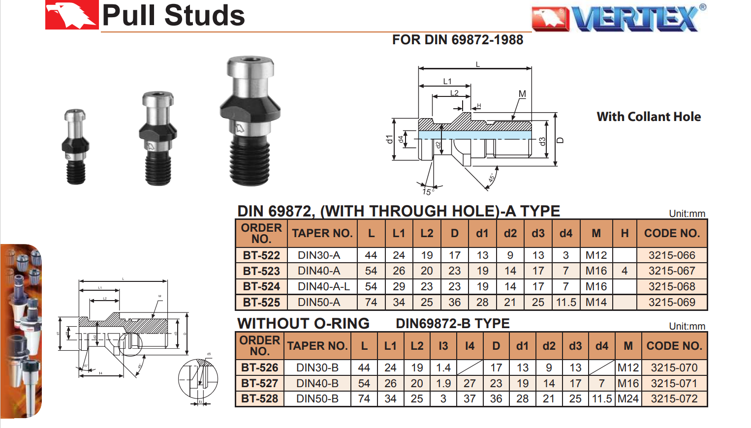– Vít rút (đuôi chuột) cho bầu kẹp BT30, BT40, BT50: BT-510, BT-501, BT-502, BT-511, BT-503, BT-504, BT-512, BT-505, BT-506, BT-516, BT-517, BT-518, BT-519, BT-520, BT-521, BT-522, BT-523, BT-524, BT-525, BT-526, BT-527, BT-528, BT-529, BT-530, BT-531, BT-532, BT-533, BT-534, BT-535, BT-536, BT-537, BT-538, BT-539, BT-540, BT-541, BT-542, BT-543, BT-544, BT-545, BT-546, BT-547, BT-548, BT-556 của VERTEX dùng lắp với bầu kẹp kiểu BT30, BT40, BT50 để hít lên đài dao máy phay CNC.