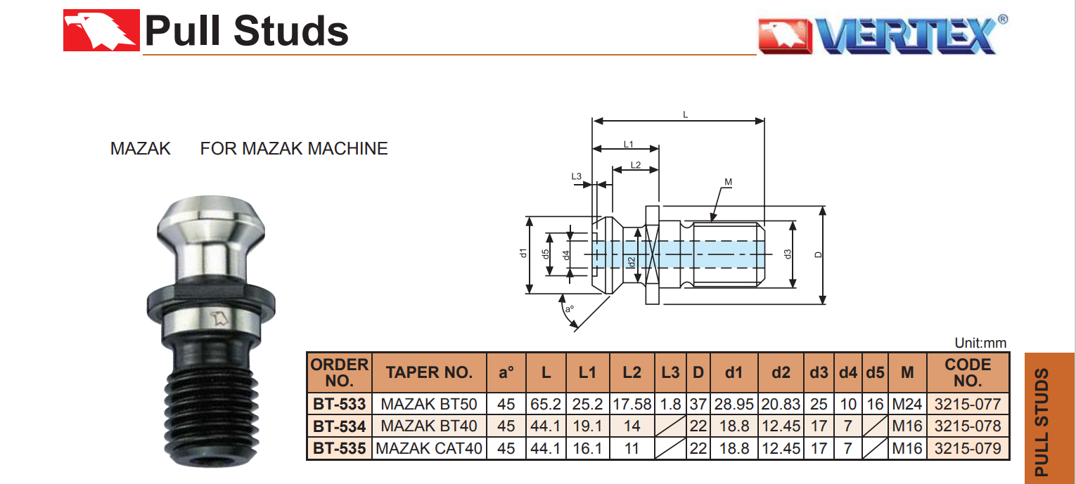 – Vít rút (đuôi chuột) cho bầu kẹp BT30, BT40, BT50: BT-510, BT-501, BT-502, BT-511, BT-503, BT-504, BT-512, BT-505, BT-506, BT-516, BT-517, BT-518, BT-519, BT-520, BT-521, BT-522, BT-523, BT-524, BT-525, BT-526, BT-527, BT-528, BT-529, BT-530, BT-531, BT-532, BT-533, BT-534, BT-535, BT-536, BT-537, BT-538, BT-539, BT-540, BT-541, BT-542, BT-543, BT-544, BT-545, BT-546, BT-547, BT-548, BT-556 của VERTEX dùng lắp với bầu kẹp kiểu BT30, BT40, BT50 để hít lên đài dao máy phay CNC.