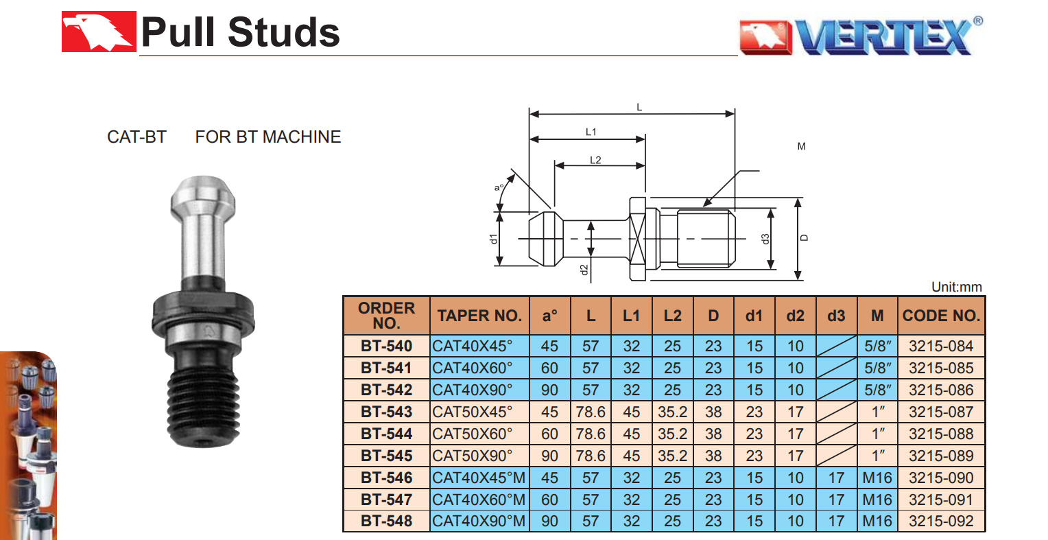 – Vít rút (đuôi chuột) cho bầu kẹp BT30, BT40, BT50: BT-510, BT-501, BT-502, BT-511, BT-503, BT-504, BT-512, BT-505, BT-506, BT-516, BT-517, BT-518, BT-519, BT-520, BT-521, BT-522, BT-523, BT-524, BT-525, BT-526, BT-527, BT-528, BT-529, BT-530, BT-531, BT-532, BT-533, BT-534, BT-535, BT-536, BT-537, BT-538, BT-539, BT-540, BT-541, BT-542, BT-543, BT-544, BT-545, BT-546, BT-547, BT-548, BT-556 của VERTEX dùng lắp với bầu kẹp kiểu BT30, BT40, BT50 để hít lên đài dao máy phay CNC.