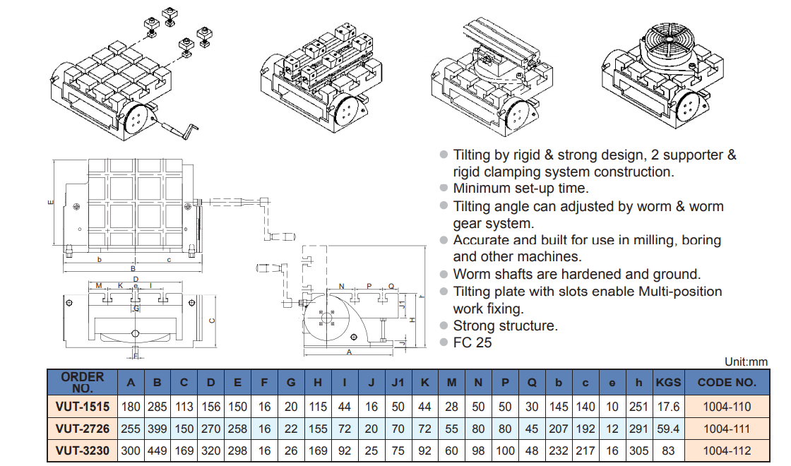 – Bàn máy phay nghiêng tải trọng nặng VUT có thể thiết lập được góc nghiêng từ 0 – 90°.
