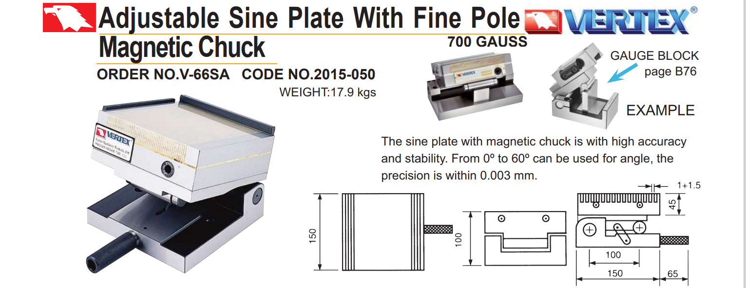 Bàn từ điều chỉnh góc nghiêng Vertex V-66SA dùng để gá các ê tô máy mài trong quá trình mài nghiêng.