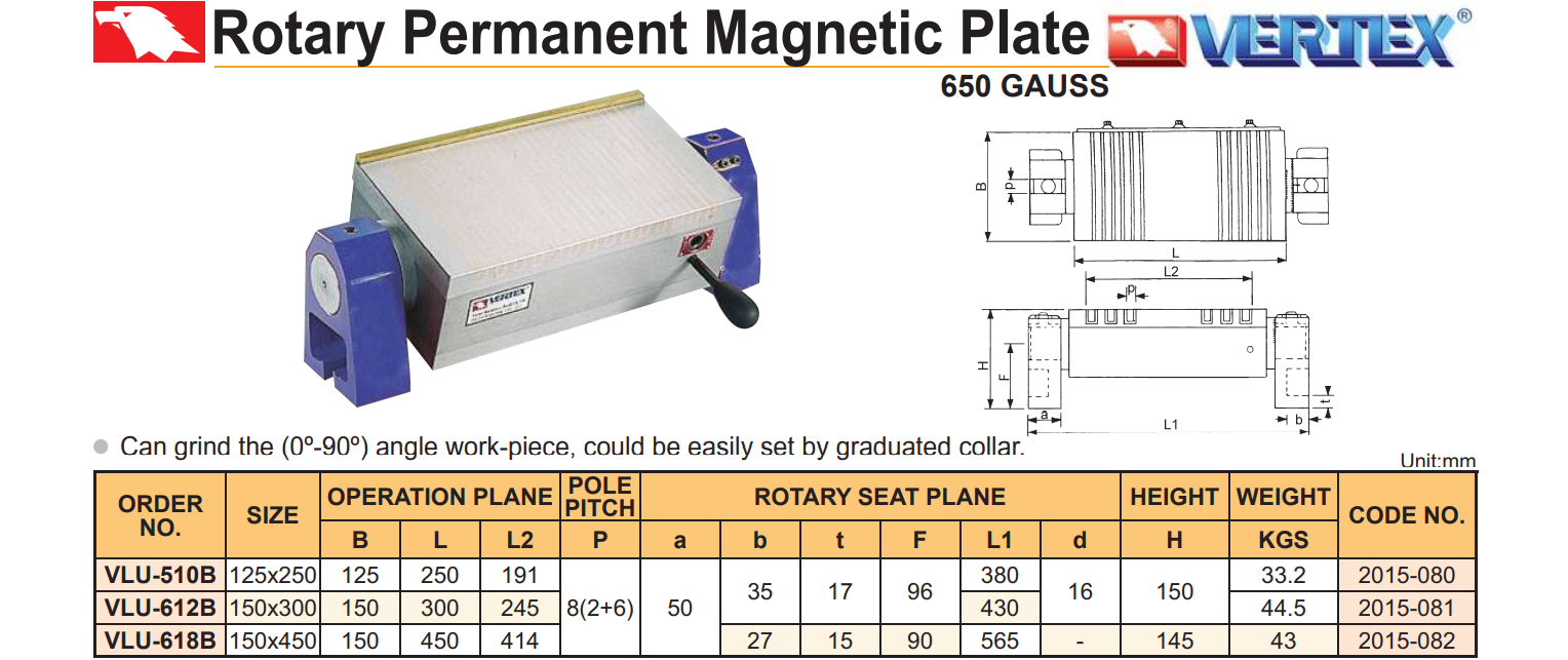 Bàn từ xoay nghiêng mã VLU-510B, VLU-612B, VLU-618B được nhập khẩu từ Vertex CO, CQ được cấp bởi phòng thương mại Đài Loan, với tính chất từ tính sẽ giúp việc gá đặt chi tiết dễ dàng thao tác kẹp chuẩn xác. Hàng được phân phối, giao tận nơi trên toàn quốc.