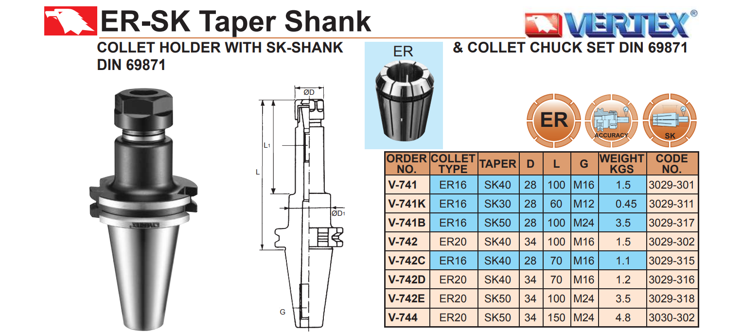 – Collet ER16, ER20, ER25, ER32, ER40 theo tiêu chuẩn DIN 6499 (xem sản phẩm Collet ER).