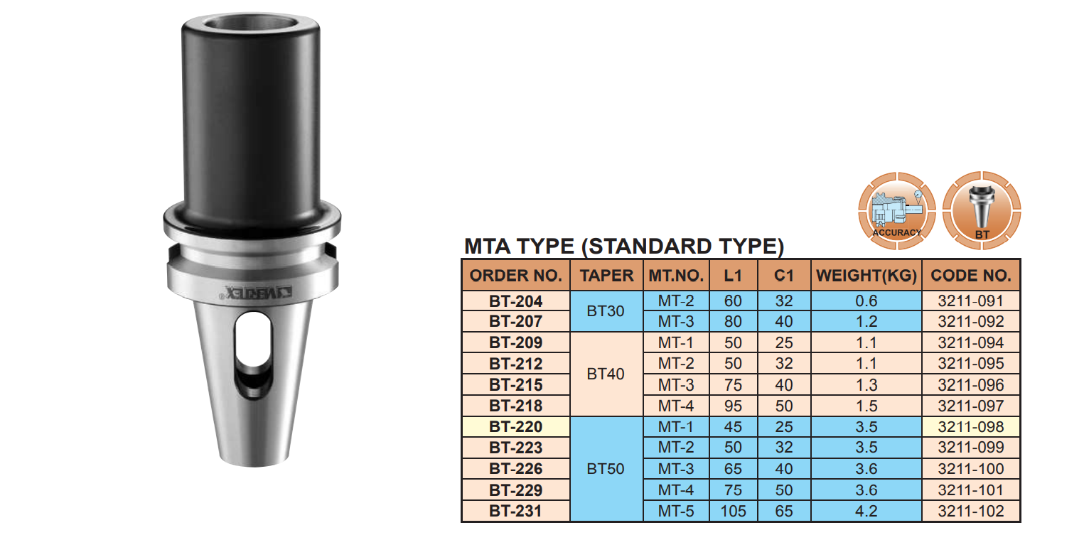 – Bầu kẹp nối chuyển từ BT30, BT40, BT50 sang MT1, MT2, MT3, MT4, MT5: BT-204, BT-207, BT-209, BT-212, BT-213, BT-215, BT-216, BT-218, BT-219, BT-220, BT-223, BT-224, BT-226, BT-227, BT-229, BT-230, BT-231 của VERTEX sử dụng kẹp các bầu kẹp chuôi côn MT, mũi khoan chuôi côn, trên máy phay CNC có kiểu côn trục chính là BT30, BT40, BT50.