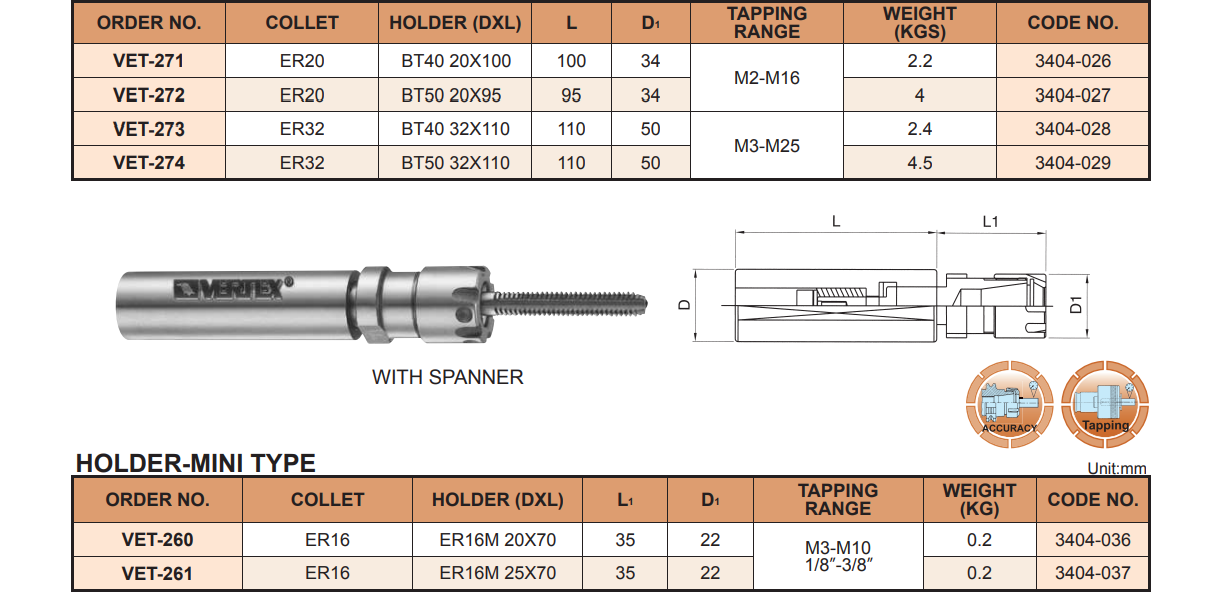– Bầu kẹp ta rô VET của VERTEX kẹp ta rô bằng các collet ER20 và ER32.