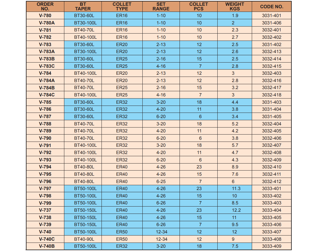 BỘ ĐẦU KẸP VERTEX KIỂU BT COLLET ER V-780, V-780A, V-781, V-782, V-783, V-783A, V-783B, V-783C, V-784, V-784A, V-784B, V-784C, V-785, V-786, V-787, V-788, V-789, V-790, V-791, V-792, V-793, V-79,4 V-795, V-796, V-797, V-798, V-799, V-737, V-738, V-739, V-740, V-740C, V-740B hãng Vertex sản xuất. Sản phẩm có đầy đủ kích thước từ các loại đầu kẹp R8 cho đến collet ER đi kèm theo bộ.