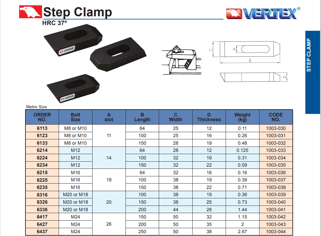 Bước kẹp 6113, 6123, 6133, 6214, 6224, 6234, 6215, 6225, 6235, 6316, 6326, 6336, 6417, 6427, 6437 được nhập trực tiếp từ Vertex, CO, CQ được cấp bởi phòng thương mại Đài Loan, sản phẩm chuyên dùng trong việc kẹp chặt chi tiết trên bàn máy khi gia công. Hàng được phân phối và giao tận nơi trên toàn quốc.