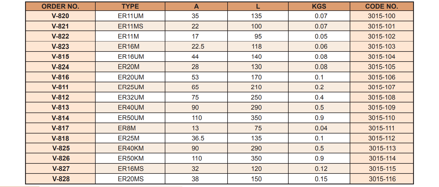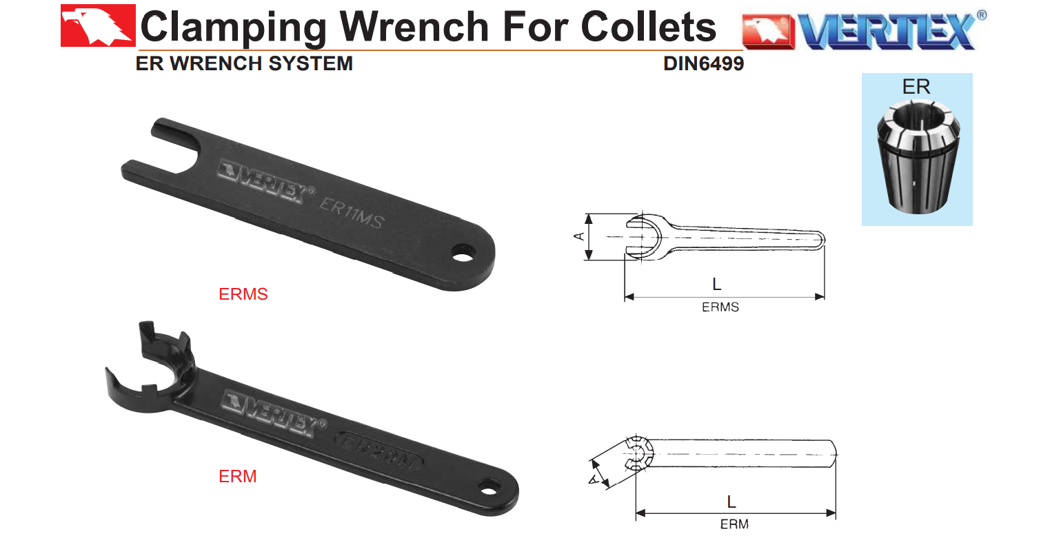 – Chìa vặn bầu kẹp collet ER8, ER11, ER16, ER20, ER25, ER32, ER40, ER50: V-820, V-821, V-822, V-823, V-815, V-824, V-811, V-812, V-813, V-814, V-817, V-818, V-825, V-826, V-827, V-828 của VERTEX dùng tháo kẹp bầu kẹp collet ER8, ER11, ER16, ER20, ER25, ER32, ER40, ER50 để tháo kẹp dao phay, mũi khoan,… trên máy phay, máy khoan cơ khí.