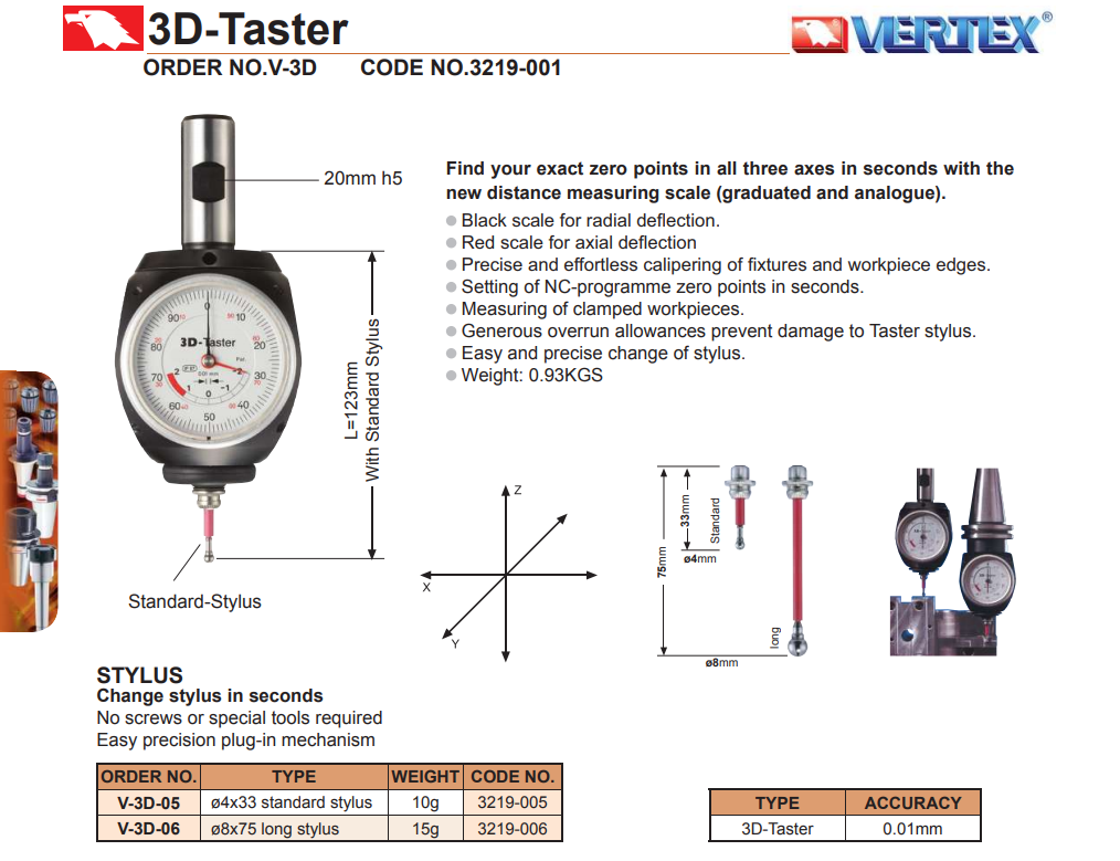 – Đầu dò 3D V-3D của VERTEX sử dụng để xác định chính xác gốc tọa độ theo cả 3 trục XYZ trên máy phay CNC.