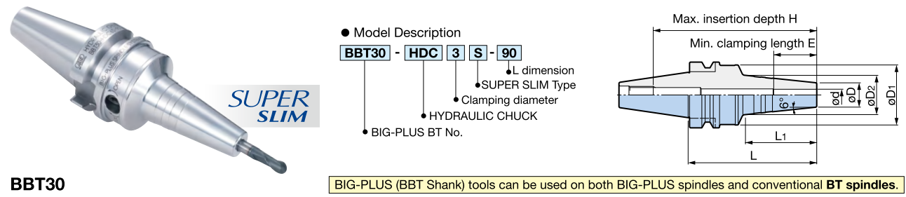 | BBT SHANK Model | Clamping diamater φd | φD | ΦD1 | ΦD2 | L | L1 | H | E |