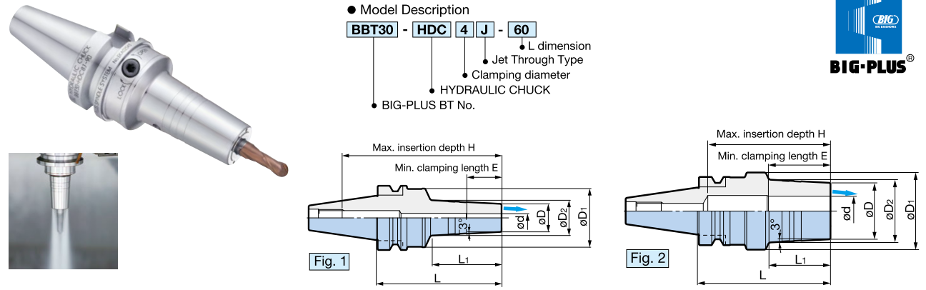 | BBT SHANK Model | Fig. | Clamping diamater φd | φD | ΦD1 | ΦD2 | L | L1 | H | E |