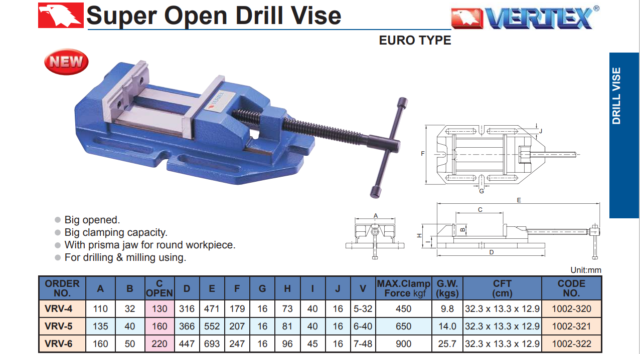 – Ê tô bàn khoan độ mở lớn VRV-4, VRV-5, VRV-6 của VERTEX có độ mở lớn. Lực kẹp lớn.