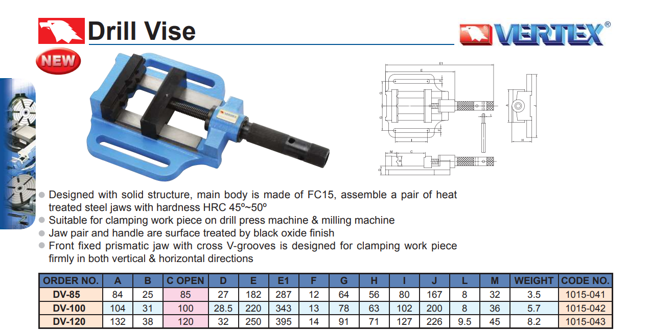 – Ê tô bàn khoan DV-85, DV-100, DV-120 của VERTEX có kết cấu nguyên khối đơn giản, chắc chắn.