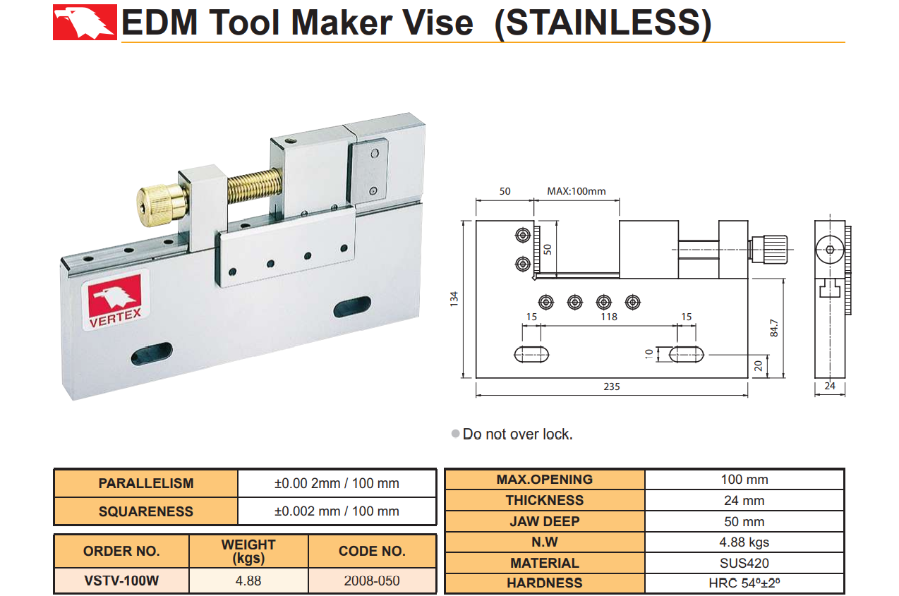 Ê tô máy EDM Vertex VSTV-100W với vật liệu là thép không gỉ, dùng để gá kẹp các chi tiết trong quá trình xung, cắt dây….