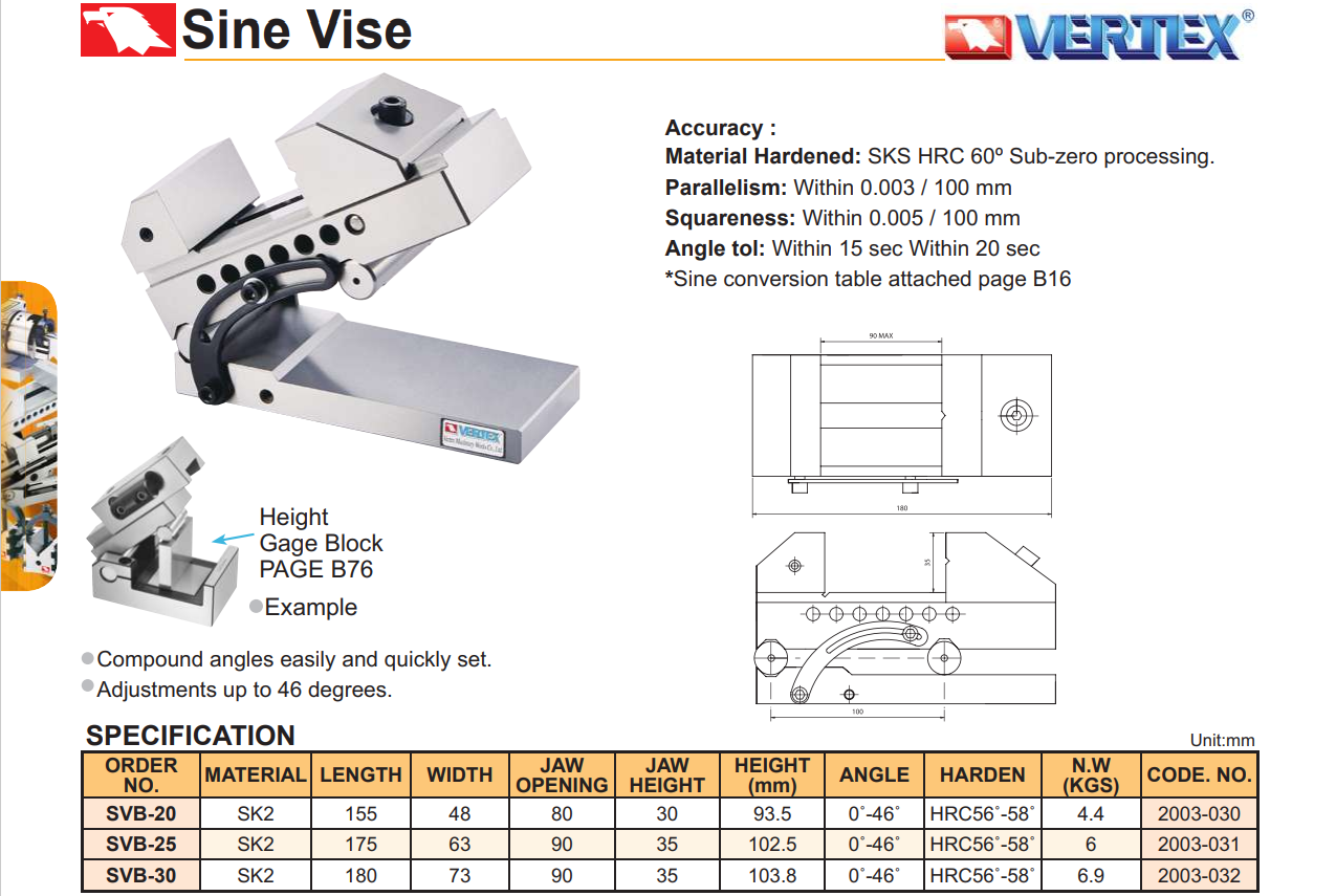 Ê tô nghiêng máy mài SVB-20, SVB-25, SVB-30 nhập khẩu từ Vertex CO, CQ được cấp bởi phòng thương mại Đài Loan. Ê tô nghiêng này được sử dụng rộng rãi cho việc kẹp chặt chi tiết trên máy mài, sản phẩm được phân phối trên toàn quốc.