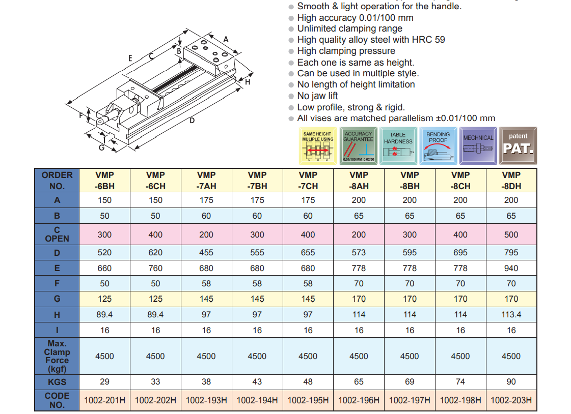 – Độ chính xác chiều cao của ê tô mô đun: 0.01/100mm.