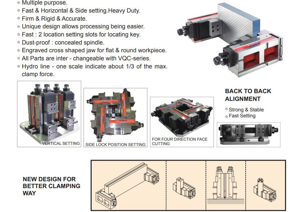 – Thiết kế tương tự dòng Ê TÔ THỦY LỰC VERTEX VQCV chỉ khác là đế có thêm mặt nghiêng phải hoặc nghiêng trái và dựng đứng khi kẹp.
