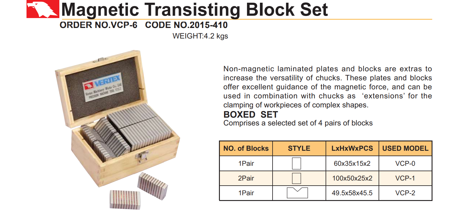 – Khối truyền từ tính VCP-0, VCP-1, VCP-2, VCP-3, VCP-4, VCP-6 của VERTEX được sử dụng để truyền từ tính từ bàn từ nam châm vĩnh cửu khi kẹp chi tiết có hình dạng phức tạp.