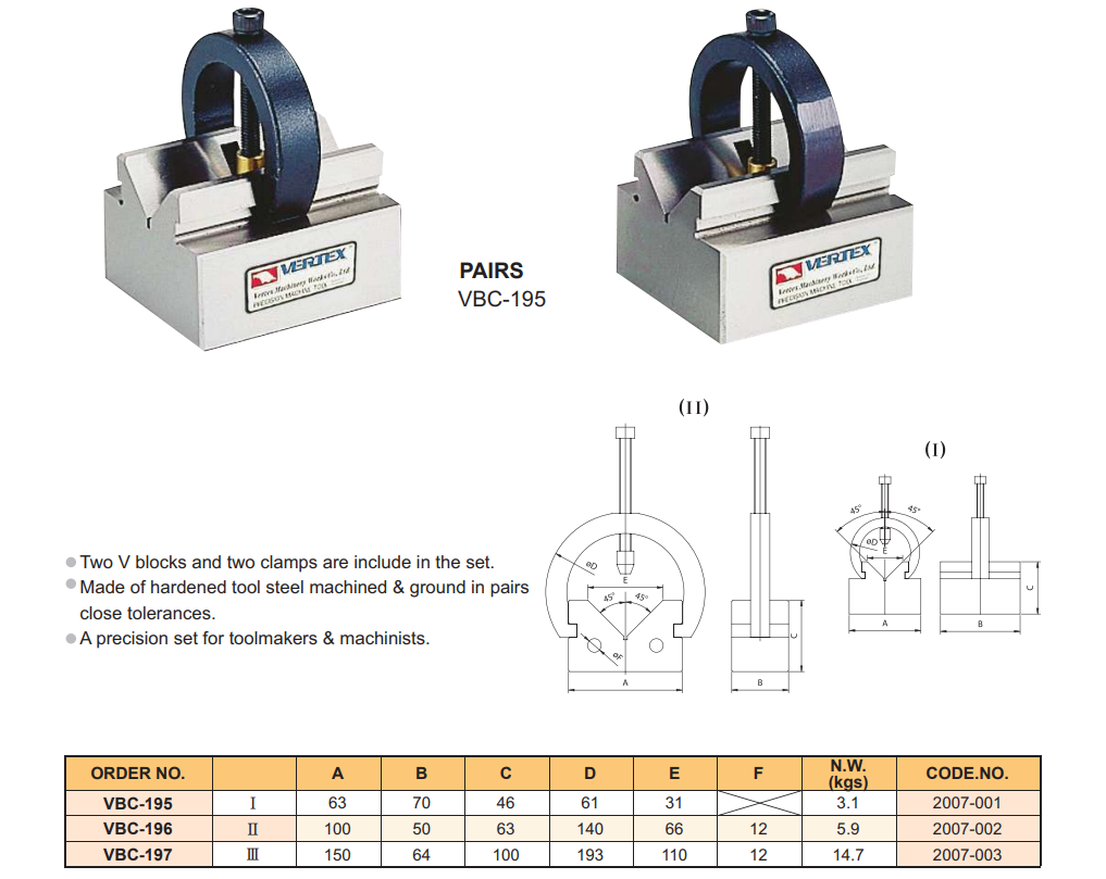 Khối V có kẹp Vertex VBC-195 dùng gá kẹp chi tiết khi gia công góc trên máy mài, máy phay, máy khoan, vạch dấu…