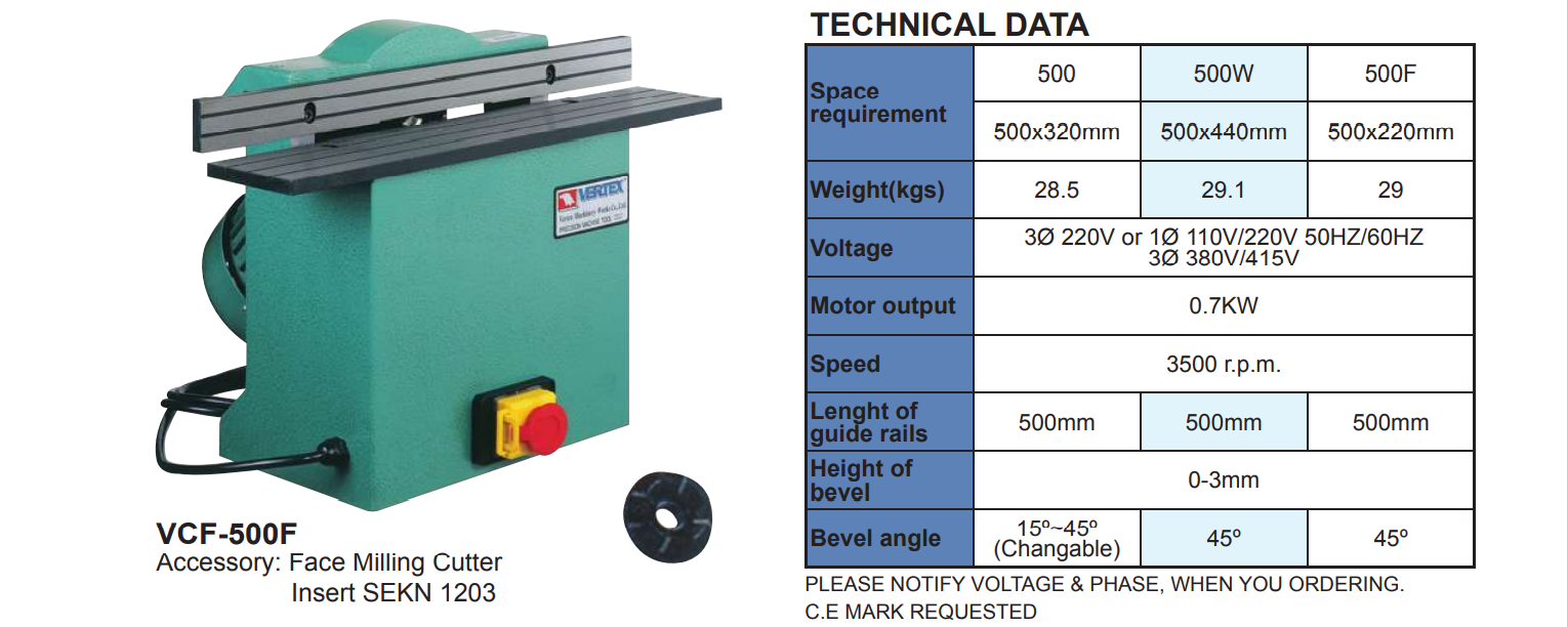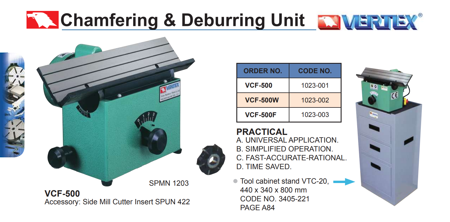 – Máy vát mép VCF-500: Sử dụng đài dao khỏa mặt gắn mảnh dao hợp kim SPMN1203. Dễ dàng thay mảnh dao khi mòn. Do đó, tiết kiệm chi phí và tăng hiệu quả gia công. Góc vát được 15°-45°.