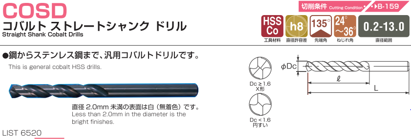 Mũi khoan NACHI LIST 6520 là dòng mũi khoan thép gió thông thường được sử dụng nhiều nhất. Thích hợp gia công thép khuôn, inox.