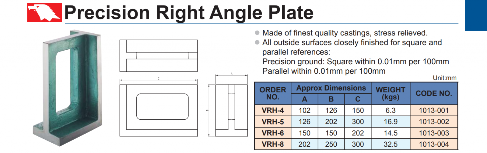 – Tấm góc vuông chính xác VRH-4, VRH-5, VRH-6, VRH-8 có kích thước chiều cao lớn, thường dùng định vị cho phôi cao.