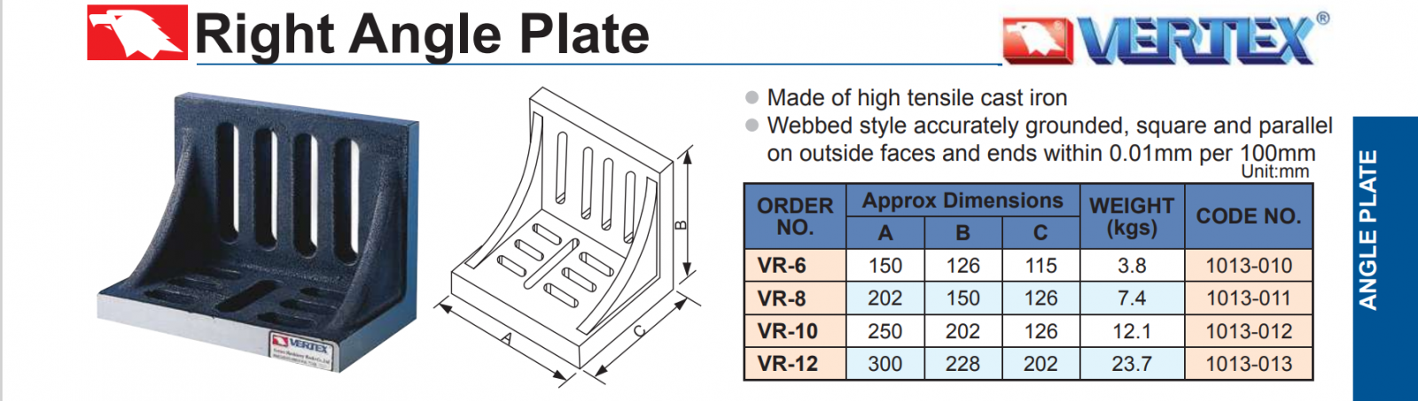 – Tấm góc vuông VR-6, VR-8, VR-10, VR-12 có kích thước chiều dài lớn, thường dùng định vị cho các chi tiết rộng.