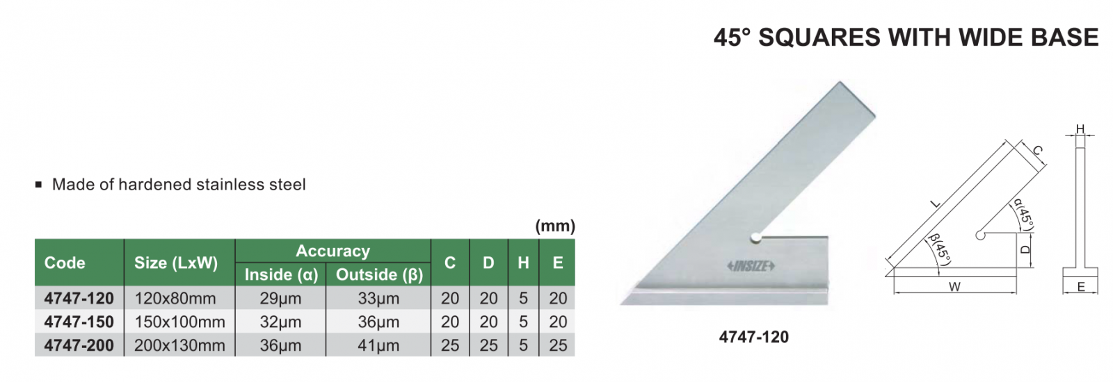 Thước đo góc INSIZE 4747-120 , 45 độ SQUARES WITH WIDE BASE 4747-120